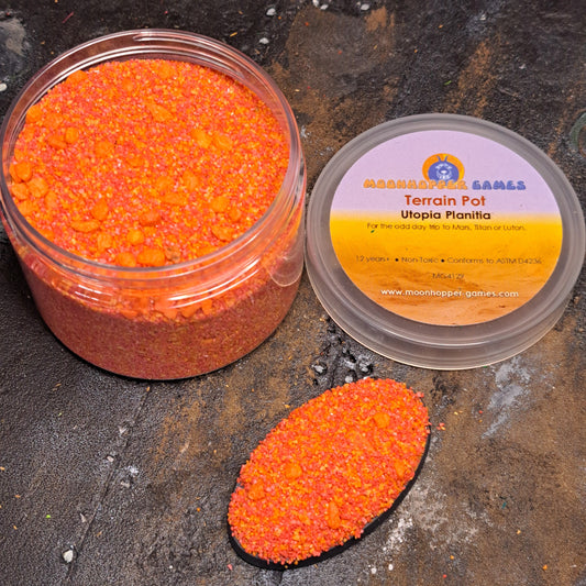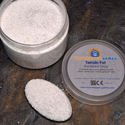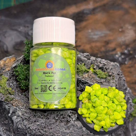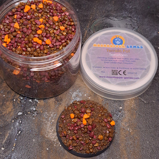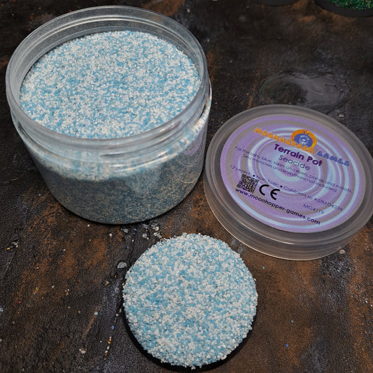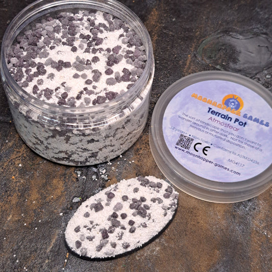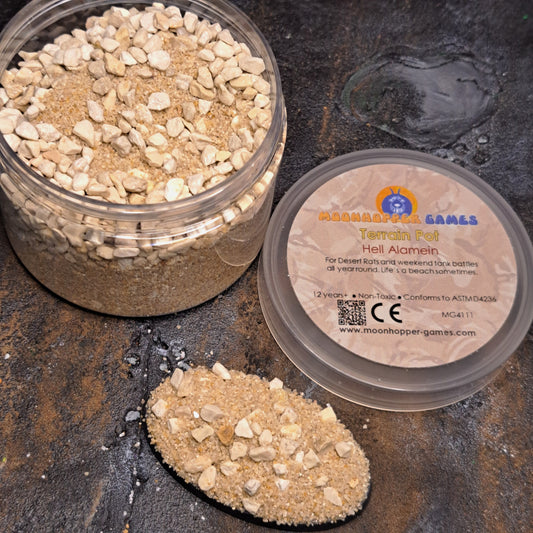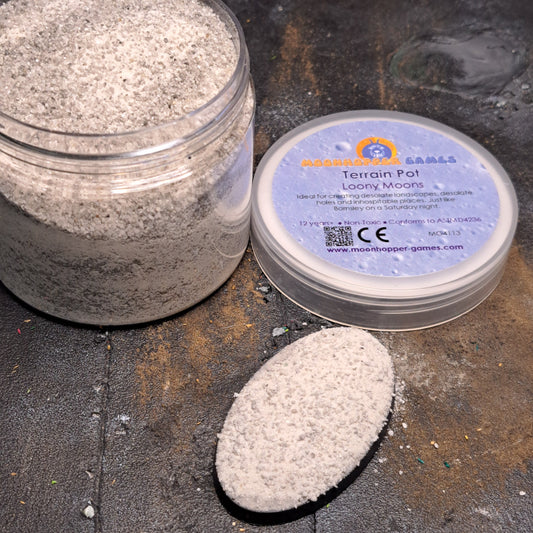 Check out our ample Terrain, Rock and Flock Pots to find the right modelling aggregate for your bases and set pieces. From the sedate deserts of World War 2 to Pixieland and the worlds of the damned, you can build anything with Moonhopper scenics.