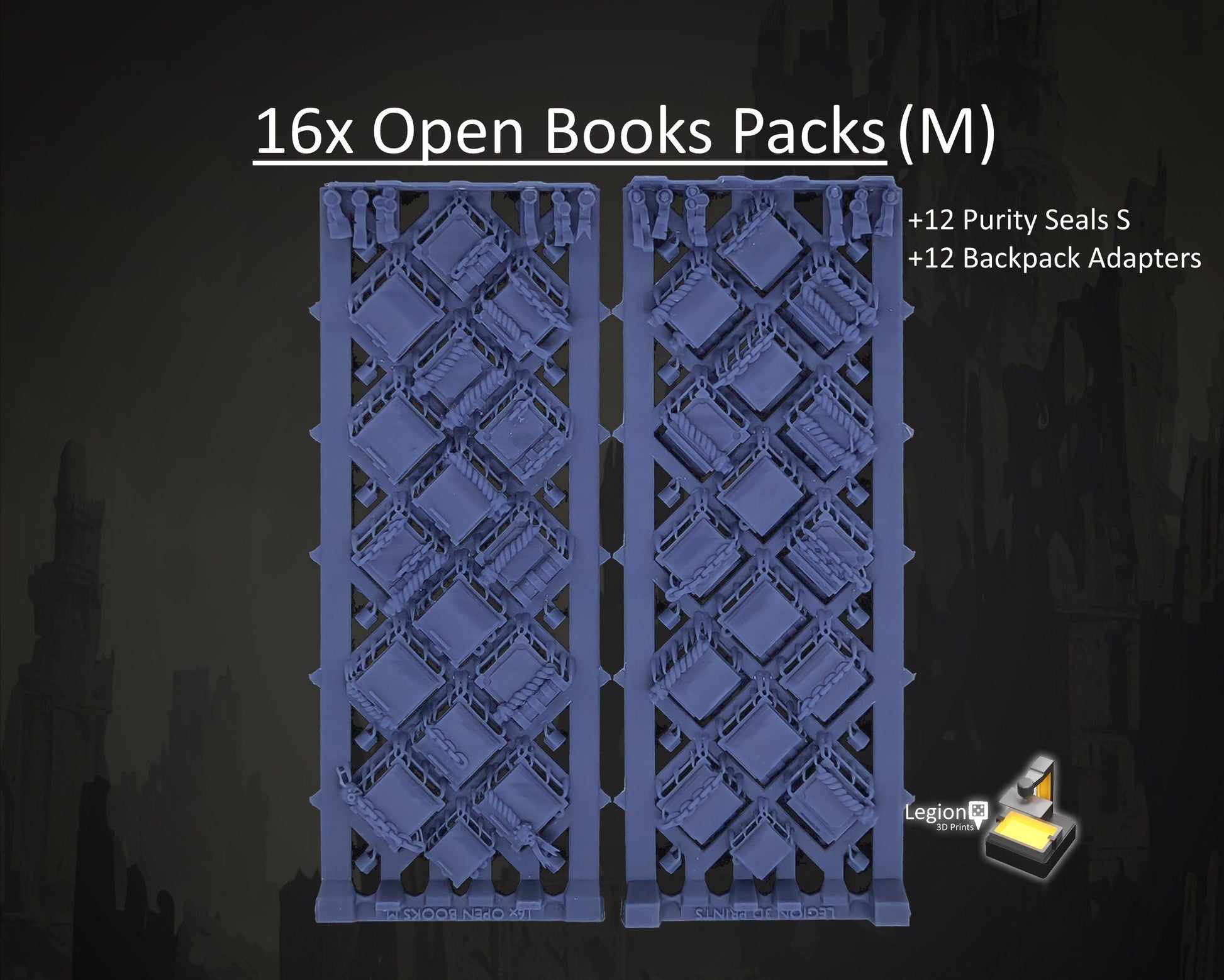 This pack features 16x Open Books (15x M, 1x S size), 12x Purity Seals S, and 12x Backpack Adapters provided on the frame for extra customisation.
