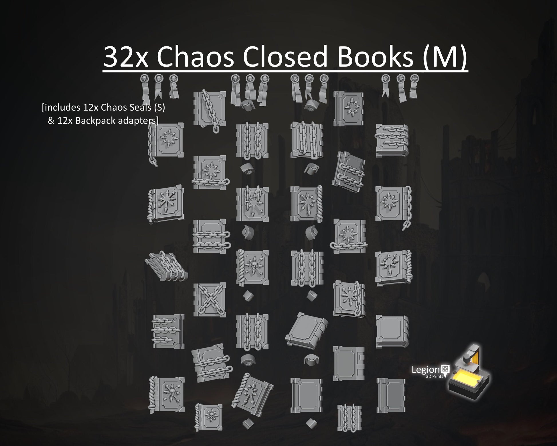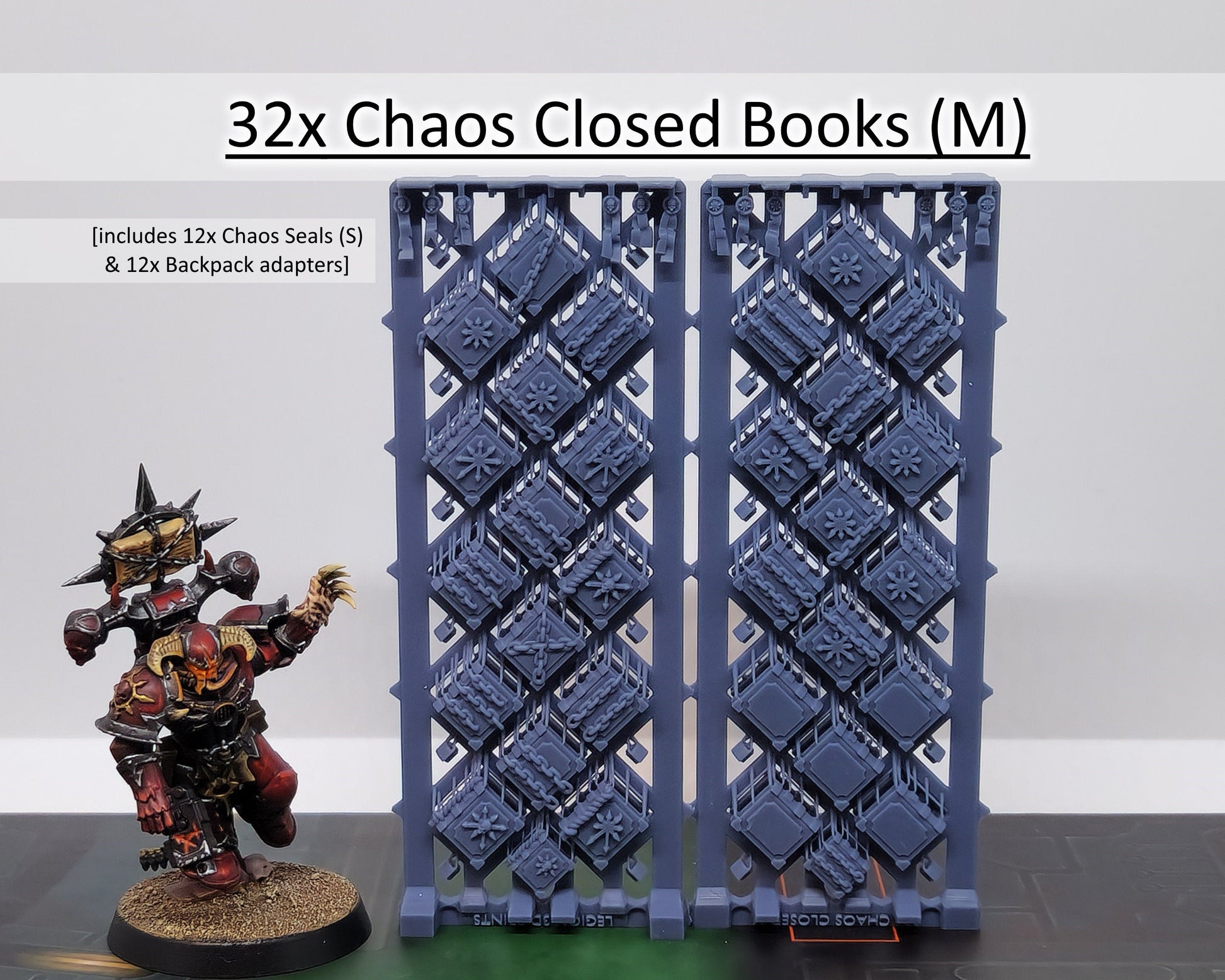 This pack features 30x Closed Chaos Books M (5x of which are plain for easy stacking), 2x Chaos Chaos Books S, 12x Backpack & Banner Pole adapters, and 12x Chaos Seals S provided on a sturdy, double-sided frame.