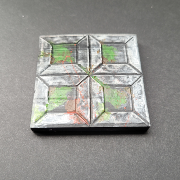 Stone floor tile pattern, ideal for old buildings and crypts, sacrificial alters and masonic lodges. Size, 50mm x 50mm x 5mm thick when printed. Can be joined with other Moonhopper resin tiles of the same size. Each side has two 2mm diameter holes centrally placed, 2mm deep spaced at 30mm (15mm each from centre, 10mm from edge).