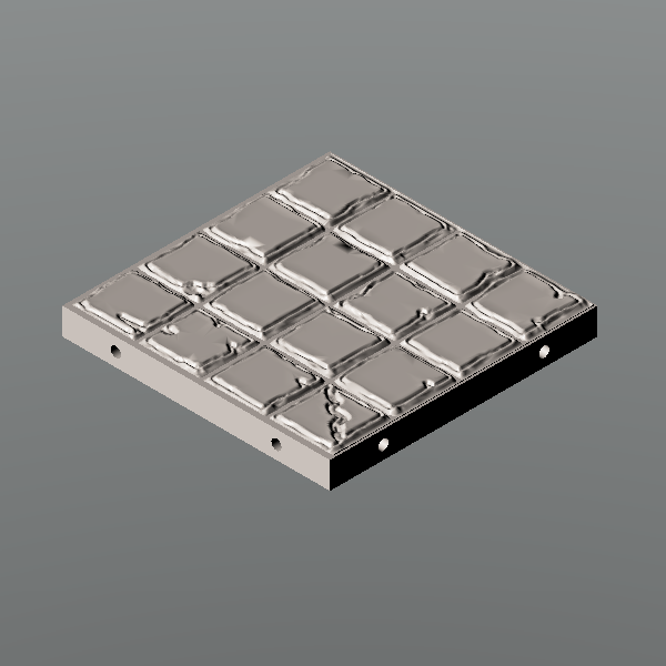 Castle floor tile - size, 50mm x 50mm x 5mm thick when printed. Can be joined with other Moonhopper resin tiles of the same size. Each side has two 2mm diameter holes centrally placed, 2mm deep spaced at 30mm (15mm each from centre, 10mm from edge).