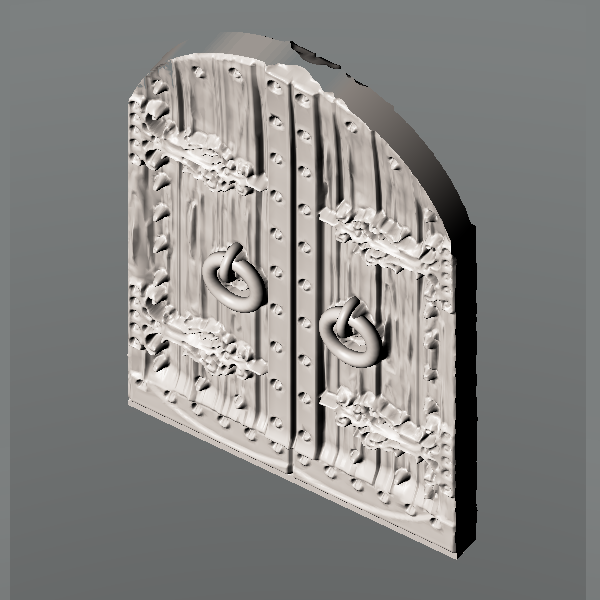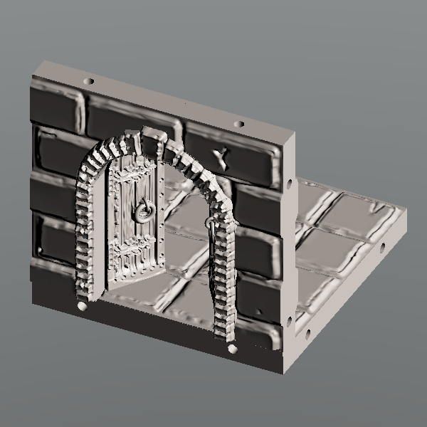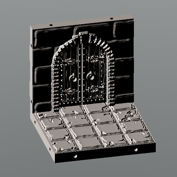 Castle door set. Includes, doors closed and open models, as well as wall with frame only and spare doors for printing. Size, 50mm x 50mm x 50mm cubed when printed. Can be joined with Moonhopper Castle range resin tiles, sized 50mm x 50mm x 50mm.