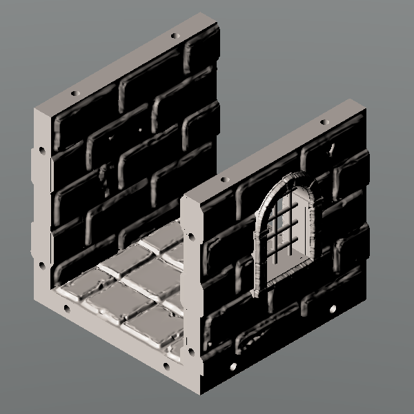 Castle walls piece with a single window one side enabling the formation of single corridors. Size, 50mm x 50mm x 50mm cubed when printed. Can be joined with Moonhopper Castle range resin tiles, sized 50mm x 50mm x 50mm.