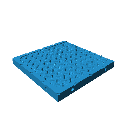 Space Station floor tile with industrial grip surrounded by three kerb edges - size, 50mm x 50mm x 5mm thick when printed. Can be joined with other Moonhopper resin tiles of the same size. Each side has two 2mm diameter holes centrally placed, 2mm deep spaced at 30mm (15mm each from centre, 10mm from edge).