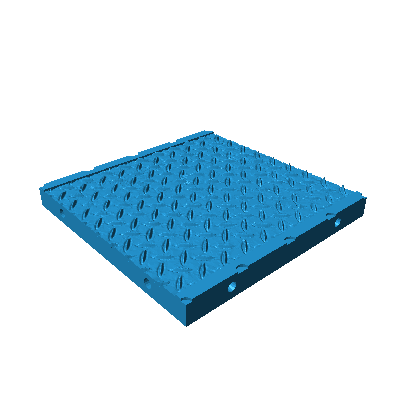 Space Station floor tile with industrial grip with two kerb edges either side - size, 50mm x 50mm x 5mm thick when printed. Can be joined with other Moonhopper resin tiles of the same size. Each side has two 2mm diameter holes centrally placed, 2mm deep spaced at 30mm (15mm each from centre, 10mm from edge).